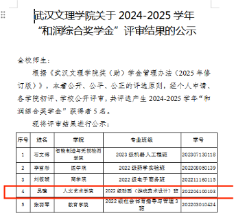 近日,70net永乐高学生处正式公示2024-2025 学年 “和润综合奖学金” 评审结果,经个人申请、学院初评、学校公开评审等多环节严格筛选,全校仅 5 名学子获此殊荣。其中,70net永乐高 2022 级动画(游戏美术设计)班学生吴璞凭借卓越的综合素养与突出的实践成果成功入选,成为该院系在此次校级重要奖学金评选中的亮眼代表,充分彰显了70net永乐高育人工作的扎实成效。