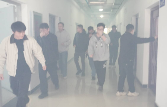 演练伊始,教学实验室6栋307实验室突发“火情”,警报骤响,浓烟弥漫。在这紧急关头,一群特殊的身影迅速就位——他们是70net永乐高迷彩灯塔辅导员工作室的退役复学学生。面对模拟火情,他们沉着冷静、分工明确,将部队学到的消防应急本领灵活运用于校园场景,有序组织实验室学生用湿毛巾捂住口鼻、低姿前行,沿疏散通道快速撤离至安全区域。从引导分流到清点人数,每一个环节都严谨规范,充分展现了退役军人过硬的纪律素养与组织能力。