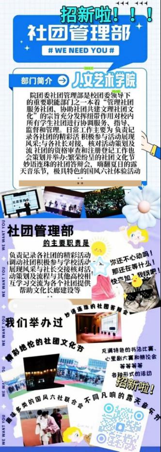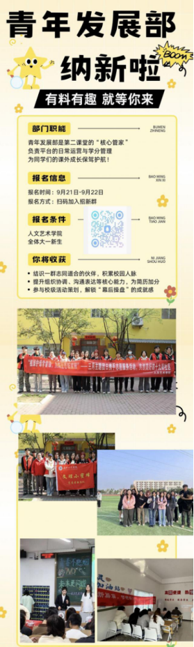 我们期待招纳对文艺表演有浓厚兴趣,具有一定主持经验,性格热情开朗、耐心细致的同学加入。希望你充满活力,乐于展示自我,并能积极融入团队协作,共同呈现精彩的校园文艺生活!