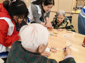 活动中,志愿者首先进行完整的操作示范,详细讲解涂色技巧与安全注意事项。随后,老人们在志愿者的陪伴下,拿起画笔,尽情发挥想象力,为原木白胚拨浪鼓涂上五彩斑斓的脸谱图案。一笔一画间,既唤醒了长者们对童年拨浪鼓的温暖记忆,也让他们在轻松愉快的氛围中感受到国粹艺术的独特魅力。期间,面对视力不佳、行动不便的老人,志愿者们便握着他们的手,一笔一划勾勒线条、填充色彩;遇到拿不稳画笔的老人,就帮着调整握笔姿势,耐心等待每一笔落下。光透过玻璃窗洒在鼓面上,也映在老人们专注的脸庞上,原本空白的鼓面,在一双双布满岁月痕迹的手中,渐渐晕染出斑斓的色彩。