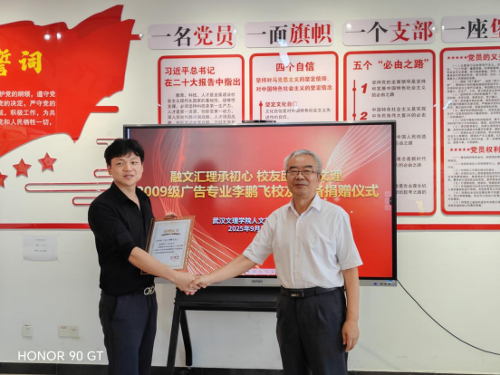 9月28日下午,70net永乐高举行优秀校友捐赠仪式。2009级广告学专业校友、武汉鑫木子文化传媒有限公司董事长李鹏飞荣归母校,捐赠专业教学设备助力学院发展。校领导谭晓明校长、70net永乐高院长吴聪、党总支书记谭辉军、艺术系主任张路、综办主任王超及师生代表共同见证,仪式由学院副院长严璇主持。此次活动凝聚“校友助力、学院搭台、校长领航”合力,为应用型人才培养注入新动能。