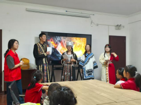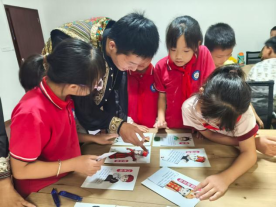 互动游戏环节,小朋友们分组合作,在志愿者的鼓励下认真将民族服饰图、名称、特色标志卡片进行配对,最快且正确的小组收获了专属贴纸,每组代表还积极分享配对思路,现场满是欢声笑语。最后的手工体验环节持续25分钟,志愿者们提前准备好材料,耐心指导小朋友制作对应民族的简易饰品,从穿线到拼接都细致帮忙,完成作品后,小朋友们兴奋地与志愿者合影,定格下温馨瞬间。